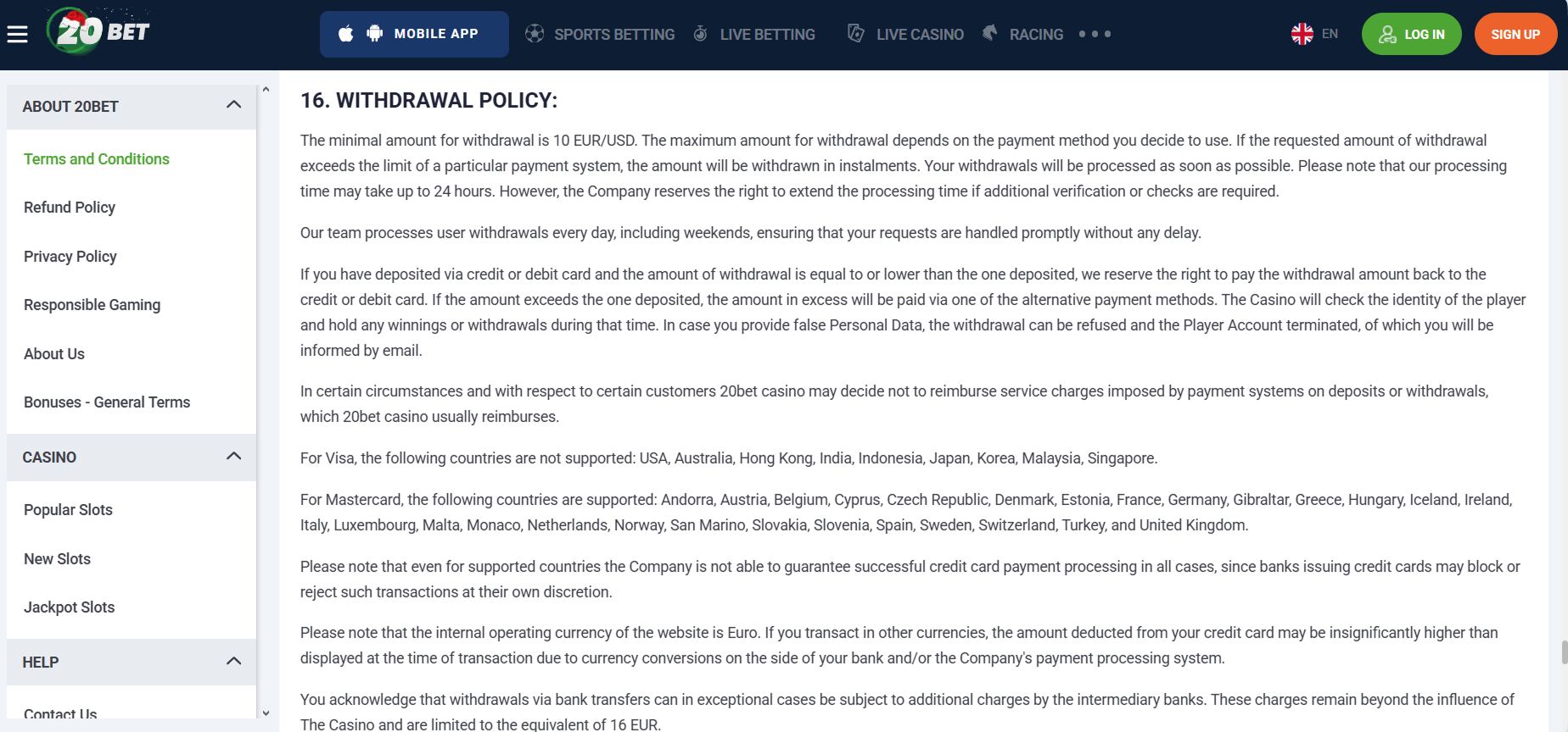 20Bet Casino’s general terms allow for limits and occasional fees through payment providers. Always check specific method details during your transaction.